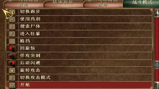 突刺、挥砍、重劈,范畴攻击、狞恶(要有学会对应特量才气用)、格挡、佯攻(也能够说是招架或者偏斜)、防卫还击、开枪、前进、向左、右、前方侧闪、吃药、收刀。