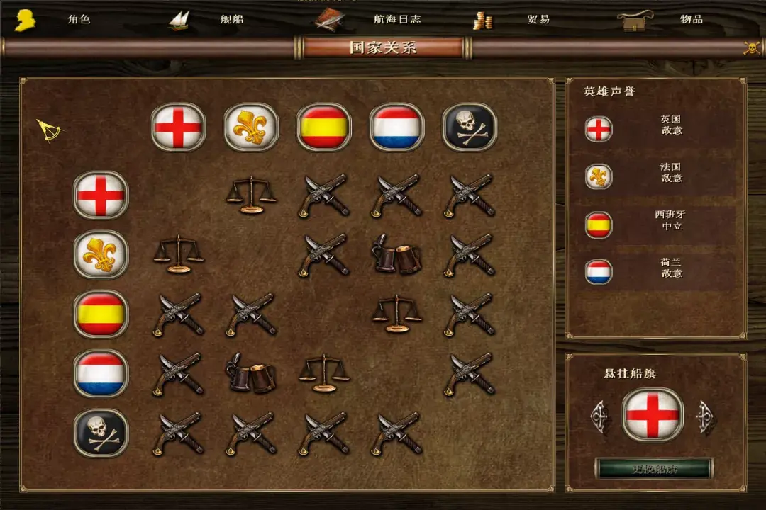 游戏中的阵营关系图在游戏中有5个阵营:英国、法国、西班牙、荷兰还有海盗。一般来说玩家的角色会是4个国度的国籍之一,而那四个国度之间都有各自的敌对或联盟关系,那些关系有时也会改动,玩家和每个国度的关系良多时候都取决于本身本国对那些国度的关系,当然,凡事都有破例。