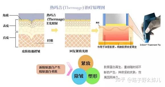 像比力常见的超声刀、热玛吉、热拉提都是通过中转筋膜层、皮肤实皮层、脂肪层,**胶原卵白再生,热能消耗脂肪来到达紧致、除皱、塑形的效果。