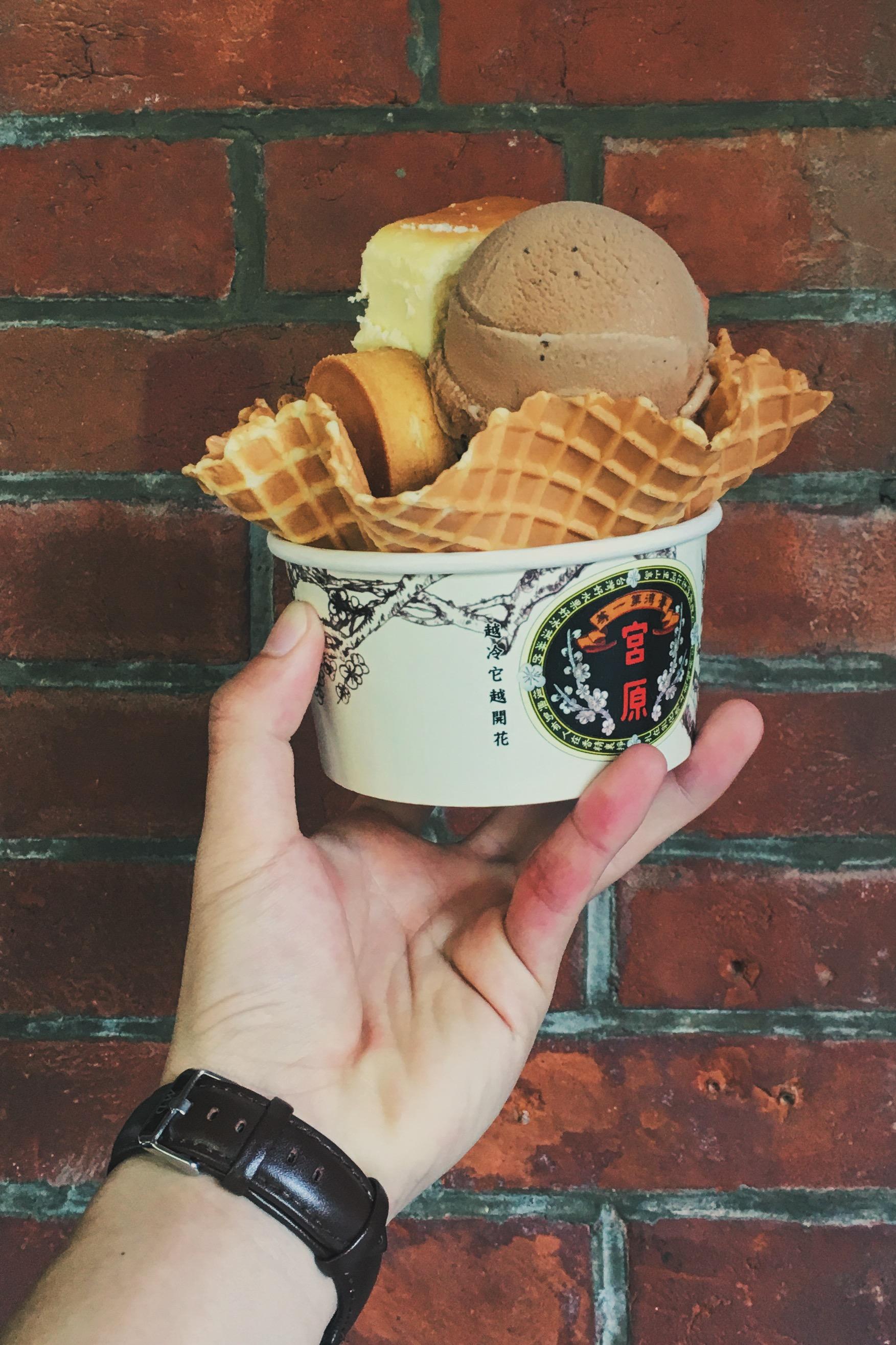 宫原眼科在台中汽车站附近,是日据时代的一家眼科病院,如今被改成了日出集团的门店(就是阿谁很出名的日出菠萝酥)。整栋房子外不雅保留了古朴的拱形骑楼气概,里面的拆修也是古典且气派,喜好吃菠萝酥的能考虑去那里买几盒。尝了宫原眼科的冰淇淋,巨峰葡萄和锡兰红茶口味的都很很很香浓顺滑,值得一试!那一盒估计36RMB(比哈根达斯好吃!)。