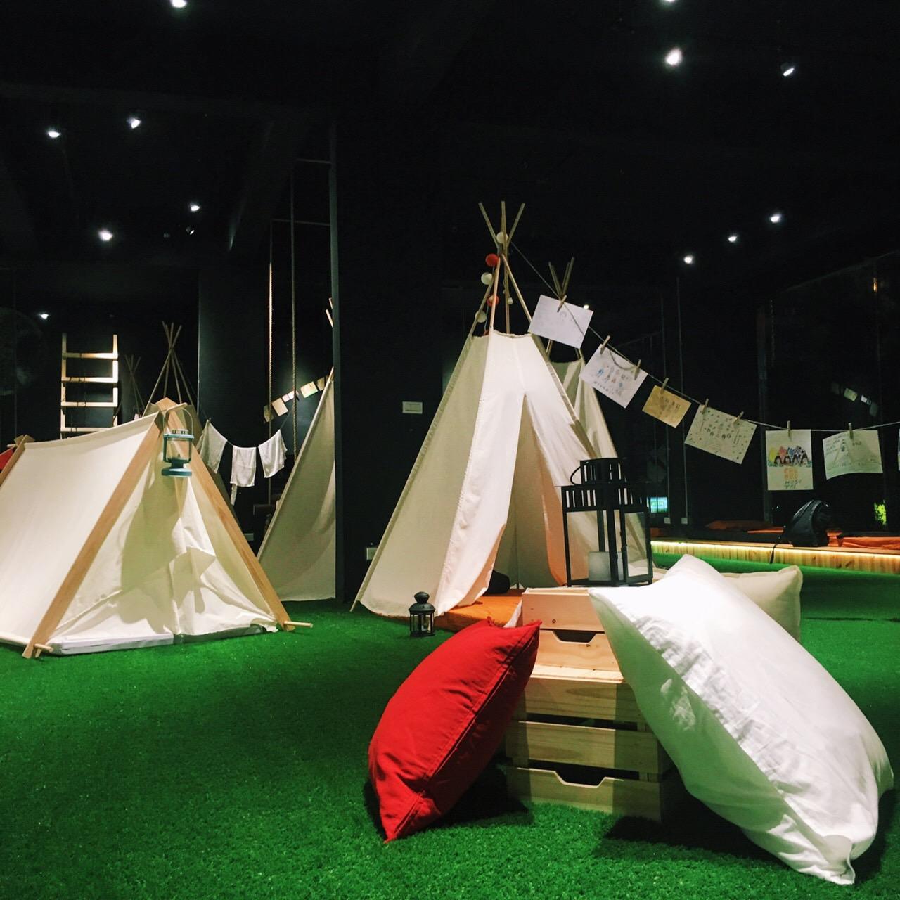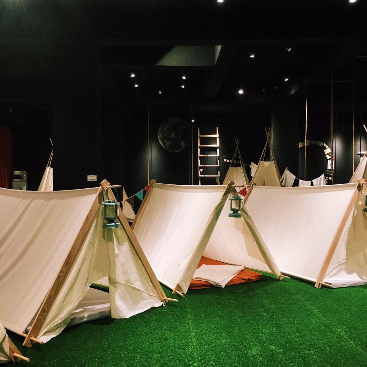 那家青旅的奇异之处,在于他是露营帐篷式的设想,loft大空间,地板上铺满了仿草地毯