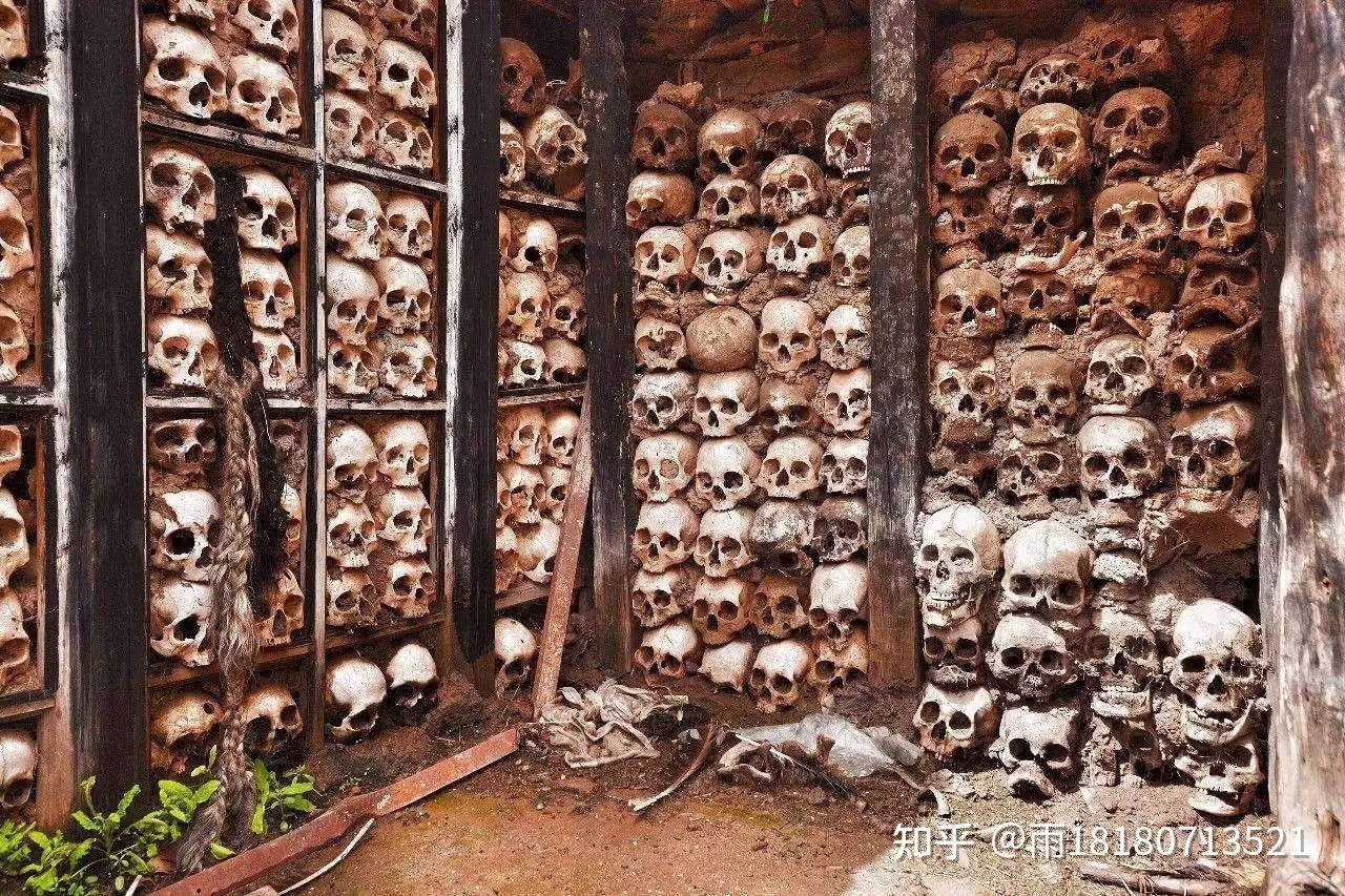 骷髅墙位于寺院北面的三间房,房内两侧各建一座尼泊尔式佛塔。门前、窗前挂着代表"天、地、水、火、风"的五色经幡和一些经布。房前是一个高约两米的三面围墙构成的小院落,有二十多平方米。 南面靠西侧的半边墙,人头骨像砖块一样一层一层地垒砌起来,大要有两百多个骷髅头骨。黑洞洞的眼窝,吡牙咧嘴,对着门与窗。胆子小的人看后估量几天都得做噩梦。墙前是几块大平石,是用来做肢解尸体的"砧板"。 达尔木寺的建造据说是因文成公主进藏路子此处时,认为此地是块风水宝地,便委托其"伦布"在此建寺,并由达布活佛主持,而实行**并保留头骨的做法,大要只要一百三十多年摆布,为何此处**保留头骨呢,至今仍是一个令人费解的谜。