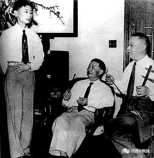 梅兰芳(中)与儿子梅葆玖(左一)在说戏