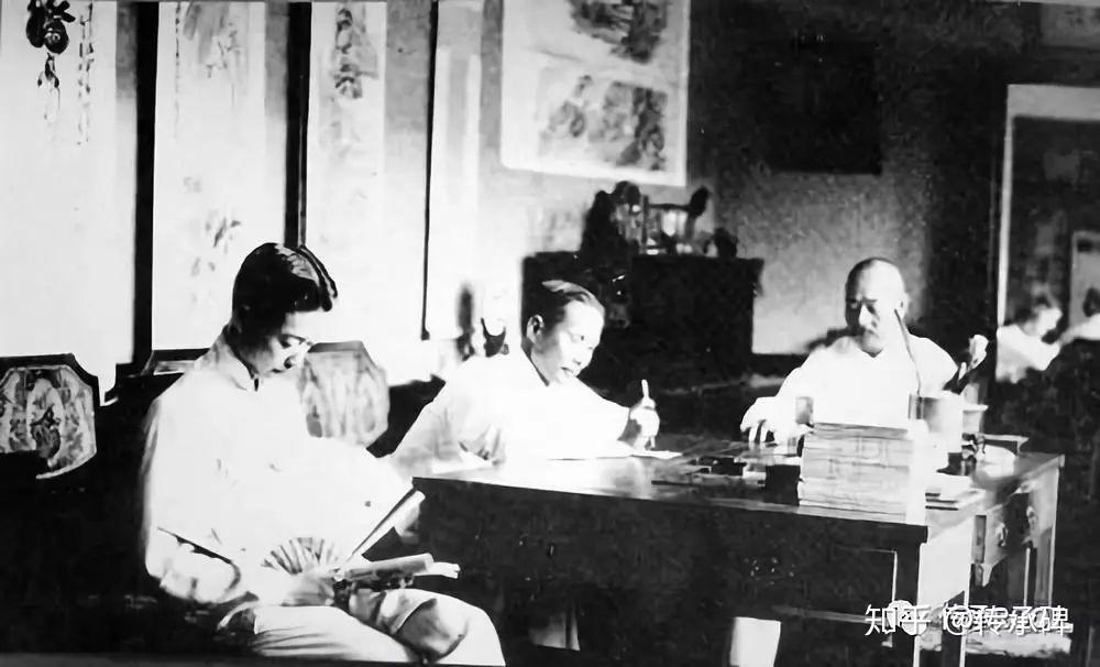 梅兰芳(左)在看剧本,齐如山在中间写剧本