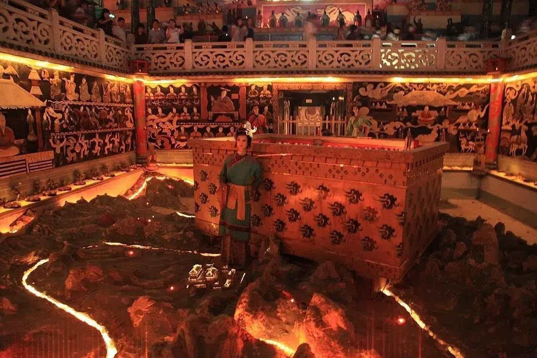 在秦始皇帝陵西侧大约2公里有两个秦陵地宫展览馆。那是两小我造旅游景点,是按照司马迁对秦陵地宫的描述所建,模仿了秦陵地宫的内部构造。