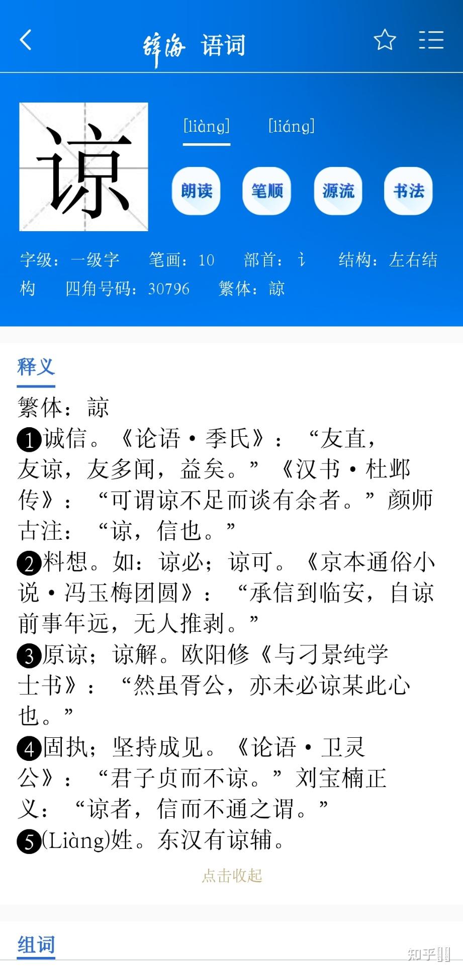 《诗经》有一句“母也天只,不谅人只”。那个“谅”是相信的意思。《辞海》App没有那个释义,但《古代汉语词典》App和《汉语大词典》App是有的,后者还拿它举了例。当然,我并不是要苛责《辞海》App八面玲珑,而是想说,要按照本身的需要去查找东西书,差别东西书之功用的偏重性纷歧样。