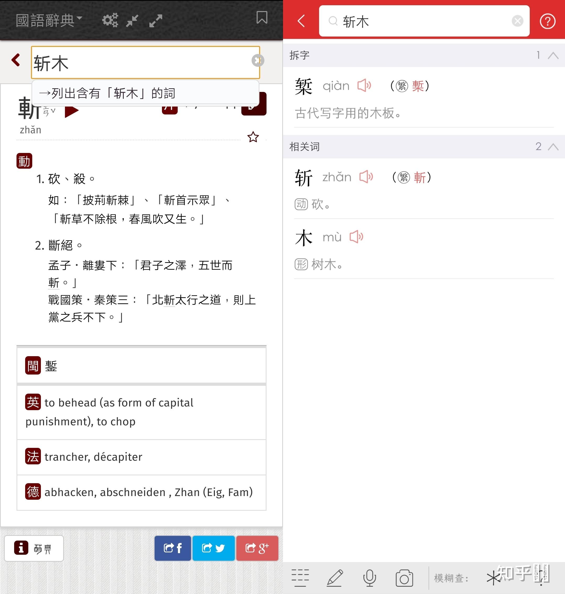 左萌典App,右古代汉语词典App还有一个细节,现代汉语词典比萌典做得好,那就是取代手写查字的组合查字,好比你想查“椠”字,不晓得读音,还得切换到手写,但是在现代汉语词典App内你就能够间接打“斩木”,搜刮框就会弹出来,若是你查的是“斩木”,下面也会显示相关词条。