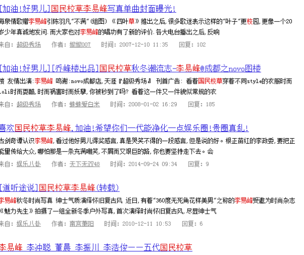 一些娱乐圈新人,也时常会有保举帖,好比如今的男神李易峰,那时候就常见“国民校草”名义的保举帖。