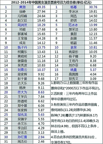 出处在此:黄渤49亿票房第一 杨幂30亿女星榜首