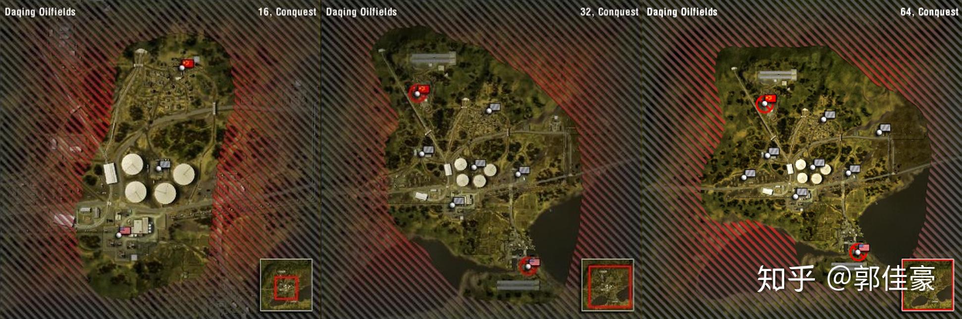 a. 游戏主体默认情况下是16人对战地图,但是通过一个额外的模组BF2SP64能够解锁更大尺寸的32人和64人对战地图;下图为大庆油田地图三个版本的比照,能够看出在64人对战中,地图上增加了更多的旗号点以及更多的载具;