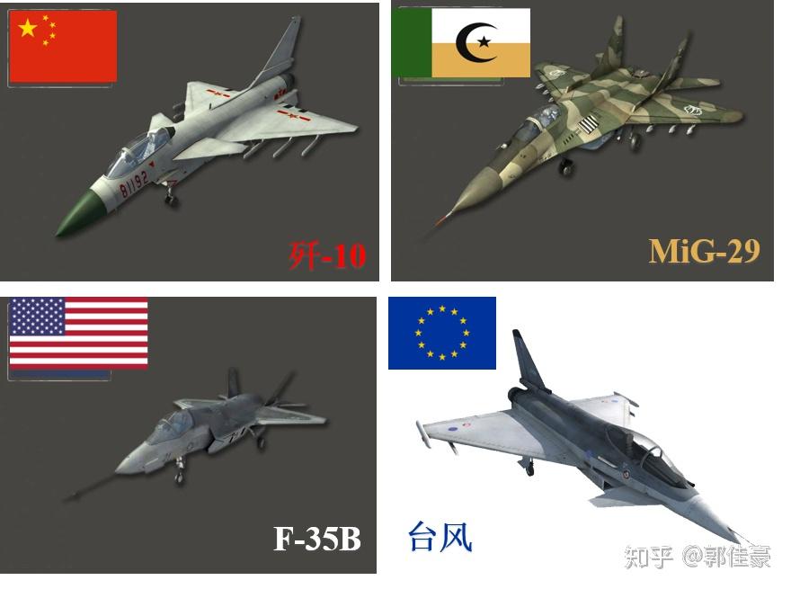 歼击机,我军是歼-10,中东是MiG-29,美军是F-35B,欧盟是台风战斗机;