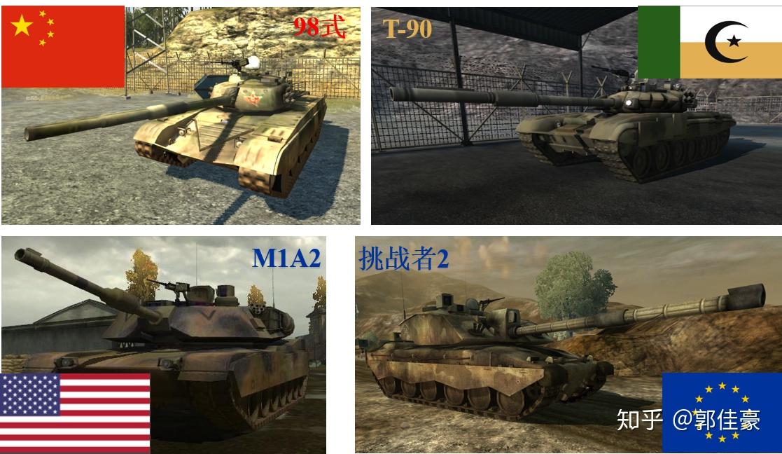 主站坦克方面,我军是98式,中东是T-90,美军是M1A2艾布拉姆斯,欧盟是挑战者2;