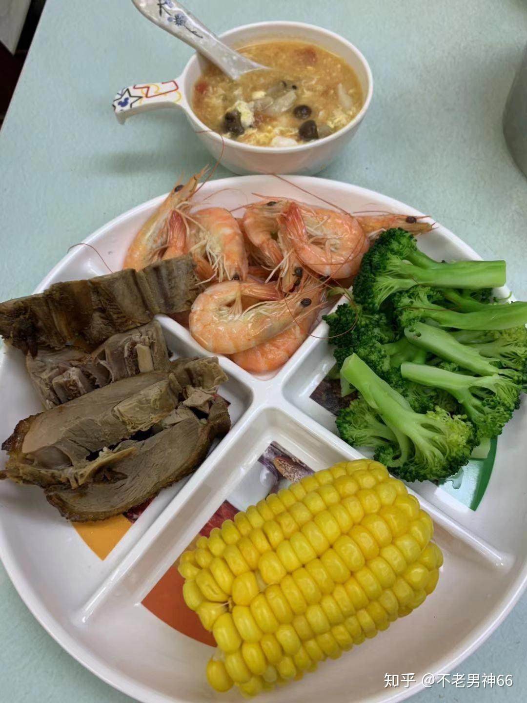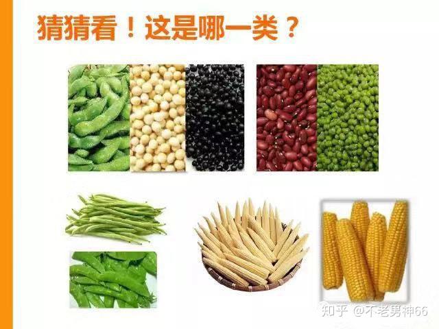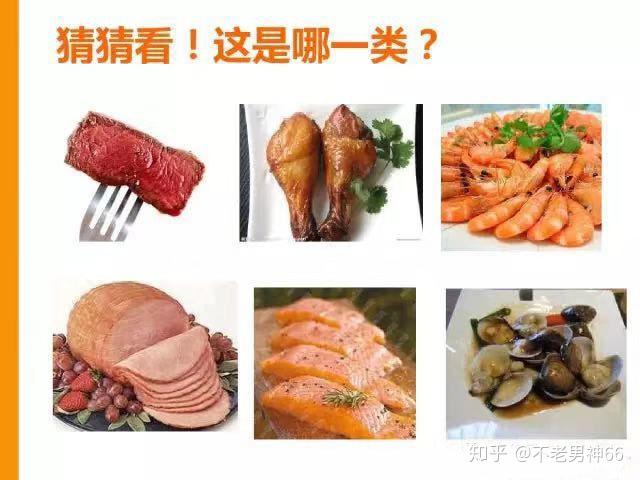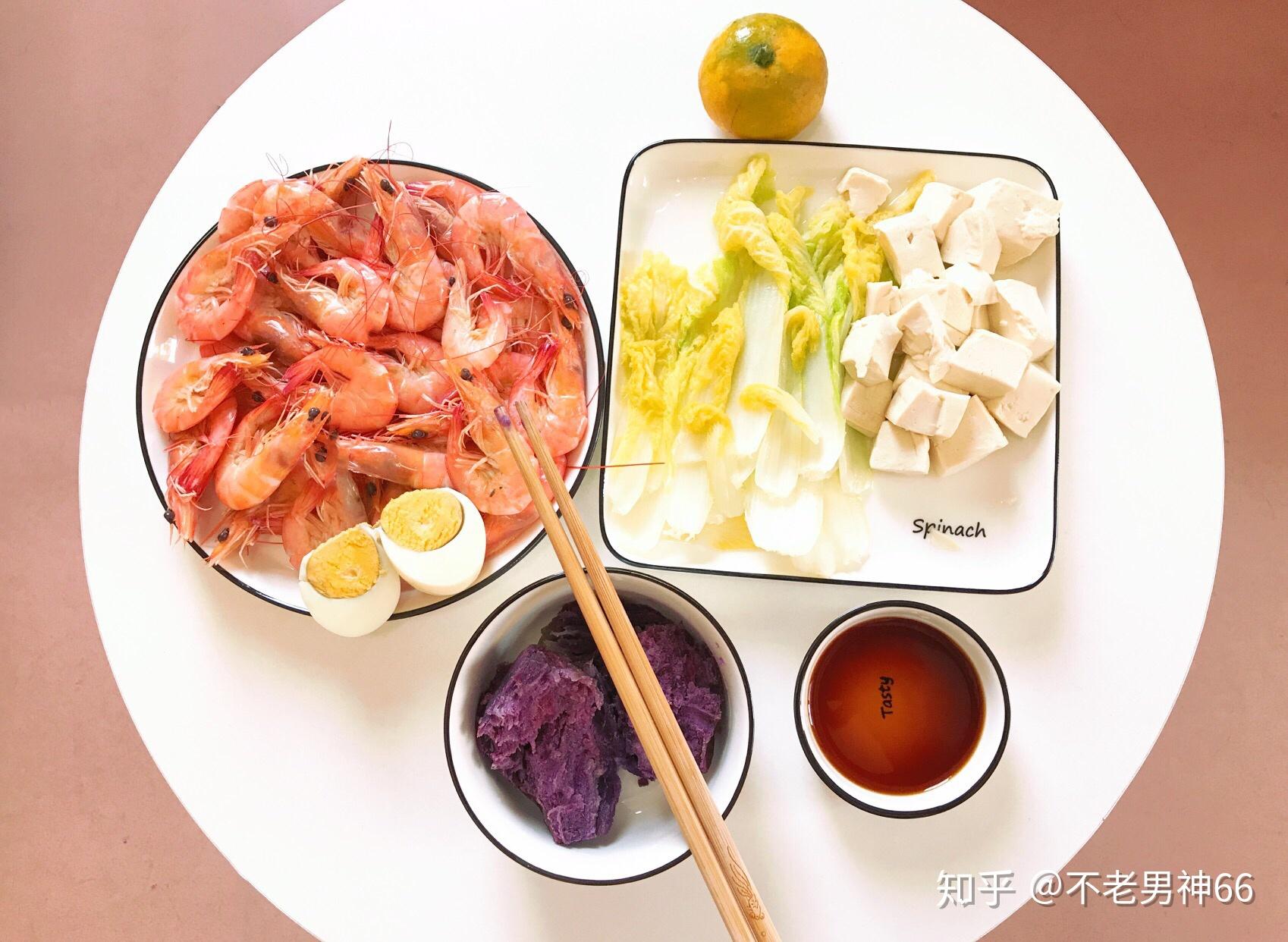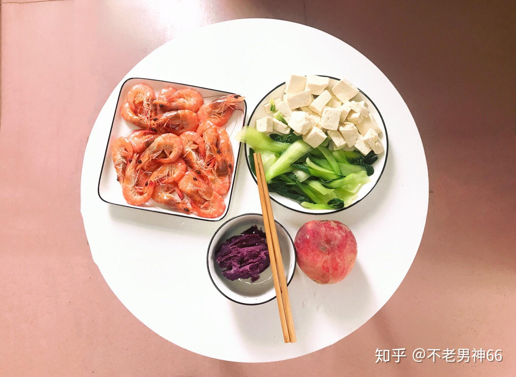 虾海鲜、牛肉(优良肉类卵白);豆腐豆皮鸡蛋(非肉类卵白);紫薯、玉米、米饭(能量五谷);西兰花、青菜、苹果(缤纷果蔬)