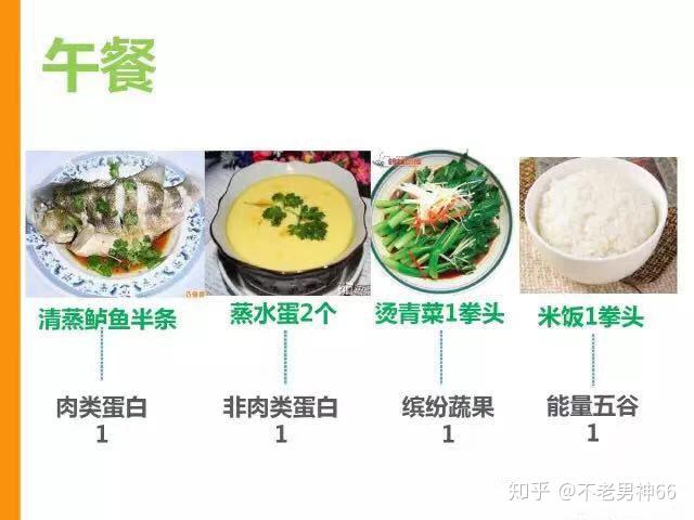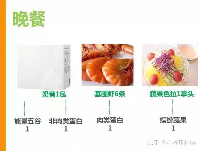 奶昔1包(取代主食),吃些肉类、海鲜之类的弥补优良卵白,或者是果蔬沙拉(沙拉选低脂的),吃7、8分饱就可!
