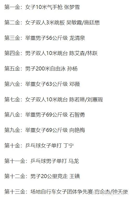 五、剩余角逐日我国队夺金点预测各人比力关心我国余下几个角逐日的夺金点,下面预测一波我国队比力有可能夺金的工程项目(若是胜利夺金的,答主会持续更新标黑,让他们一同来看看最初能标黑几个):