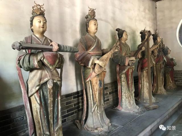 元代泥塑乐伎像共十四尊。塑像分两边摆列,一边为管弦乐,一边为冲击乐;手平分别持有笛子、琵琶、三弦、拔、手鼓、大鼓等乐器。