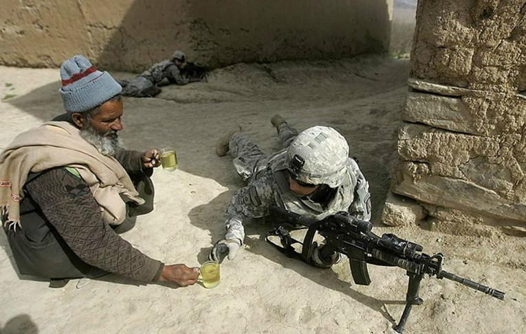 阿富汗巴格达Charahi Qambar战俘营,三名青年人诡计拿起洒在雪中的番茄酱