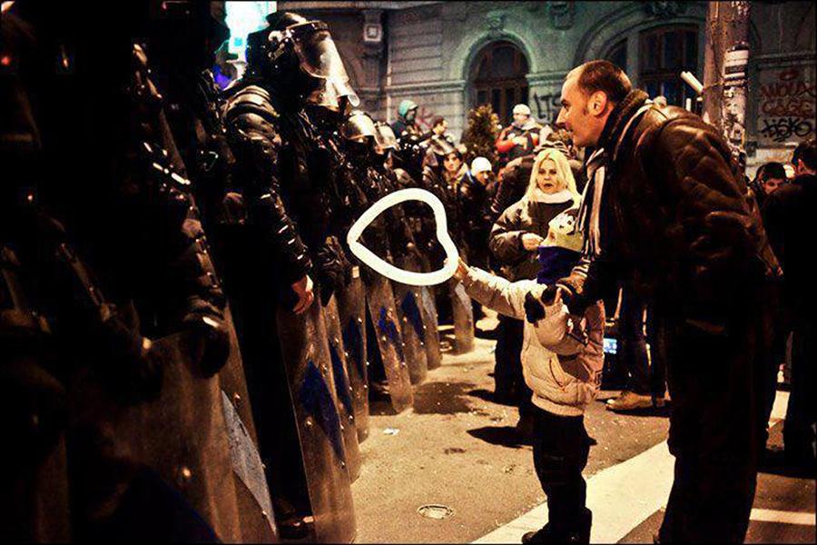 罗马尼亚儿童将爱心气球送给了抗暴差人。