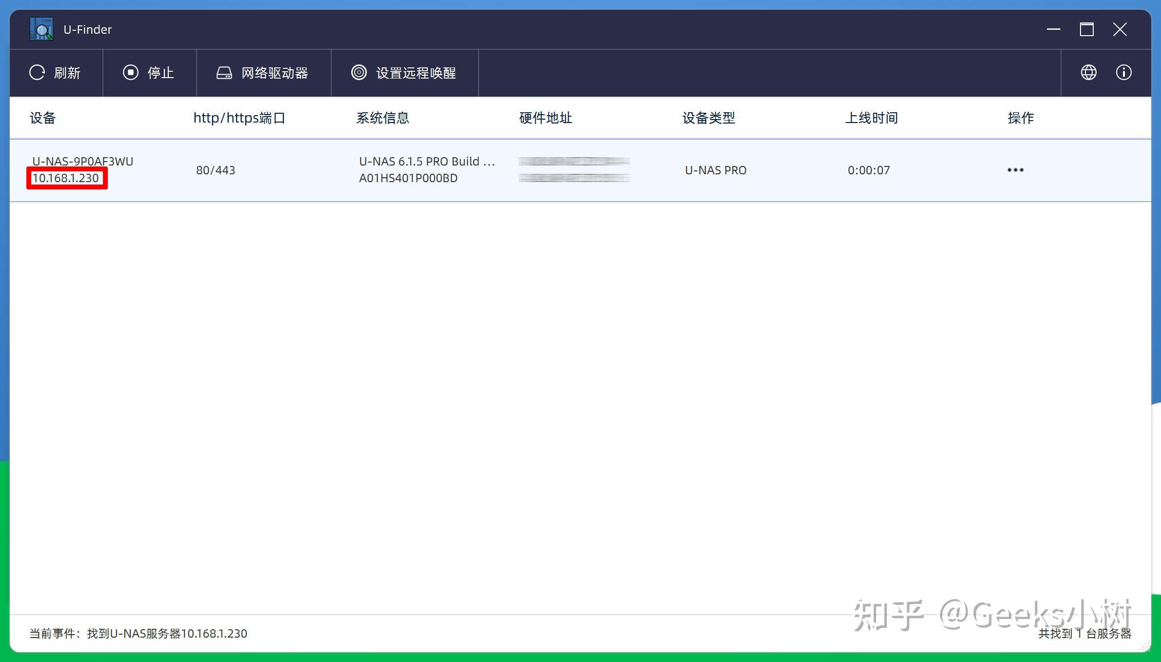 起首能够通过路由器后台查看万由HS-401P的IP地址,也能够通过官网的U-Finder搜刮助手停止查询,如图所见,万由HS-401P私有云互联网缓存已经停止联网了,通过查询之后我的IP地址为10.168.1.230。
