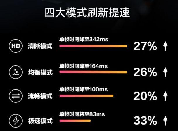 官方数据:按照长虹尝试室测试数据计算,极速形式下更优12.04帧/s,流利形式下更优10帧/1s,平衡形式下更优6.09帧/s,明晰形式下更优2.92帧/s。A9刷新帧率计算公式如下:1秒=1000毫秒(ms),1000/12.4=83,由此得出结论,单帧是83ms。