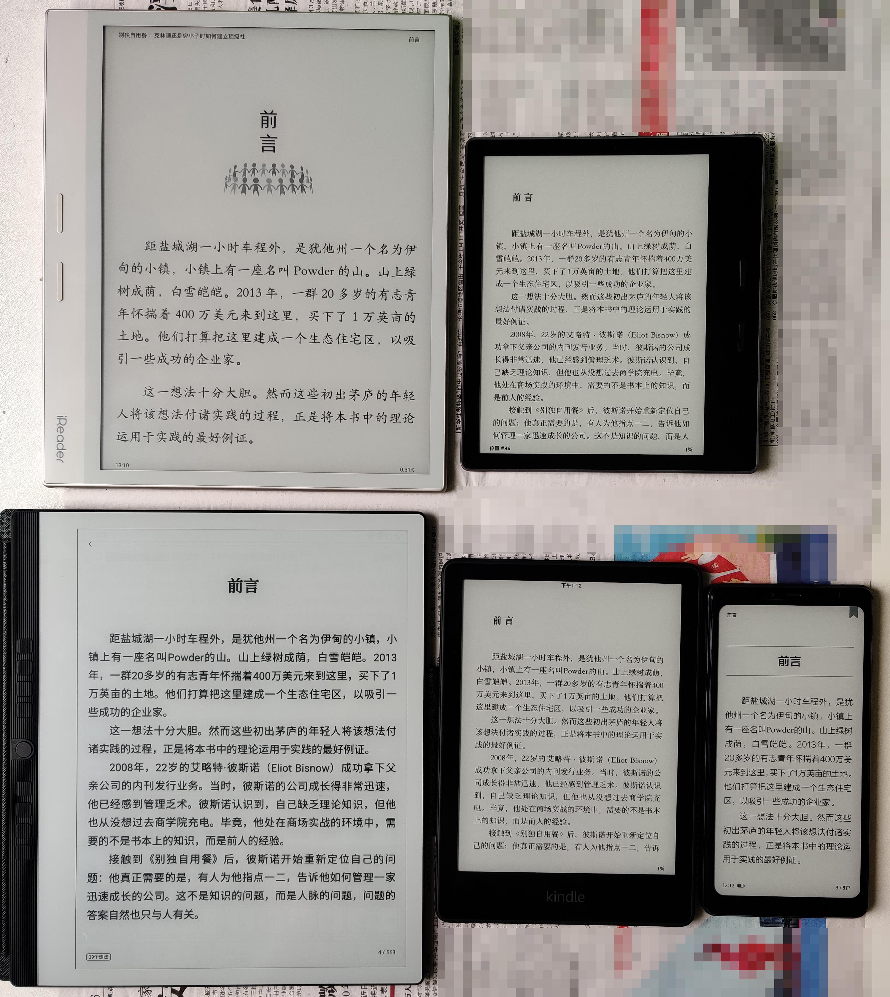 左上为掌阅**art3,左下为汉王N10,右上为KO3,右下为KPW5和长虹A9汉王N10的萤幕底色又白又亮,文字对照度很高,更接近实在的白纸黑字效果,目前N10已经被我评为国产油墨萤幕上的标杆了。