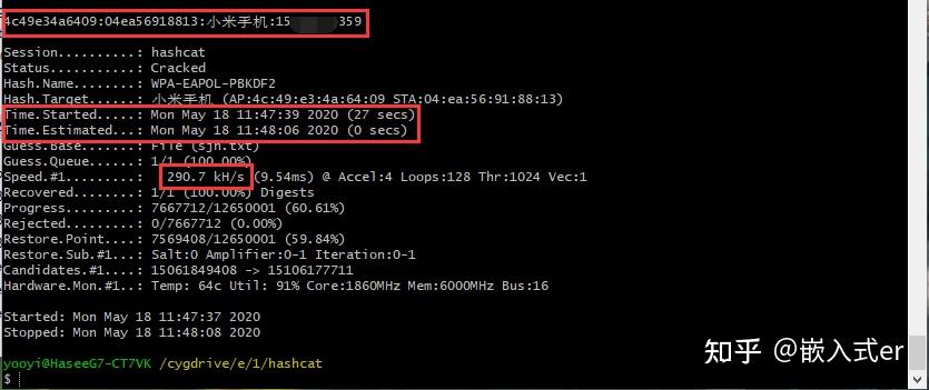 4.若补齐胜利,方可看到公钥,在原号令后添加 --show、翻开hashcat目次下hashcat.potfile也可查看公钥。图中可看到补齐用时27秒,速度290kH/s,相当于每秒测验考试29w次,是上一种体例的23倍,速度极快。