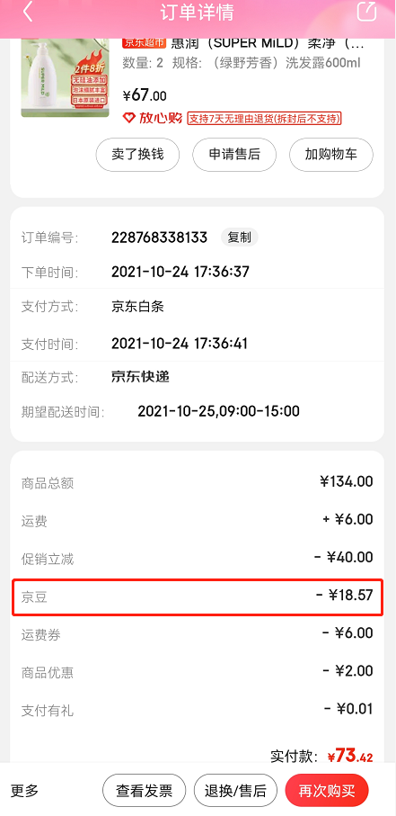 我看我买的洗发水,是用了各类折扣后,还用了京豆减免,超等廉价,我俩瓶下来是73!
