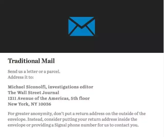华尔街日报WSJ网站给出的“匿名供给信息体例”,第一个渠道就是传统邮件,对通俗人来说那个体例最可靠,第三个才是通过Tor洋葱收集送达。
