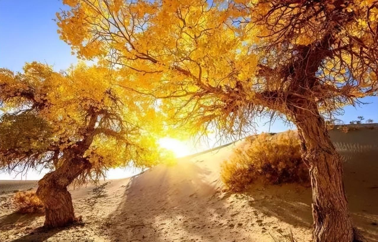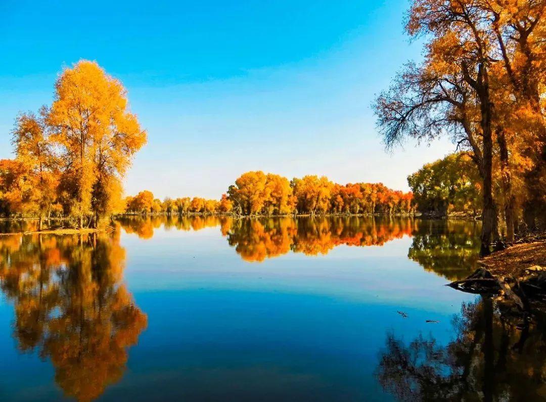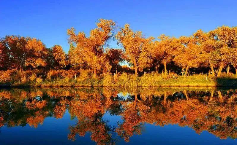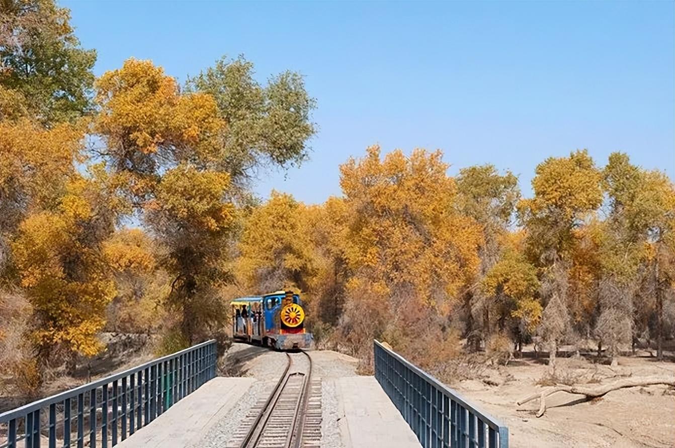 塔里木河两岸的胡杨披黄挂金,错落有致地倒映在水面上,林间有条长达十三公里的铁路,似乎代替童话当今世界。