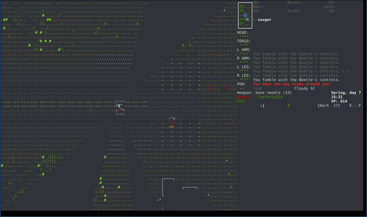 大灾变暗中之日:做为世界末日的最初一个幸存者,你需要不竭寻找物资、对于僵尸活下去,游戏同样拥有丰硕内容:职业有烟鬼、成衣、技工、手艺员;技能有会谈、急救、烹调……数不清;此外游戏能开车、砍怪、建立……那游戏都能。不说了,就是下面那货,我的截图没错,配角是@,画面请自行脑补~