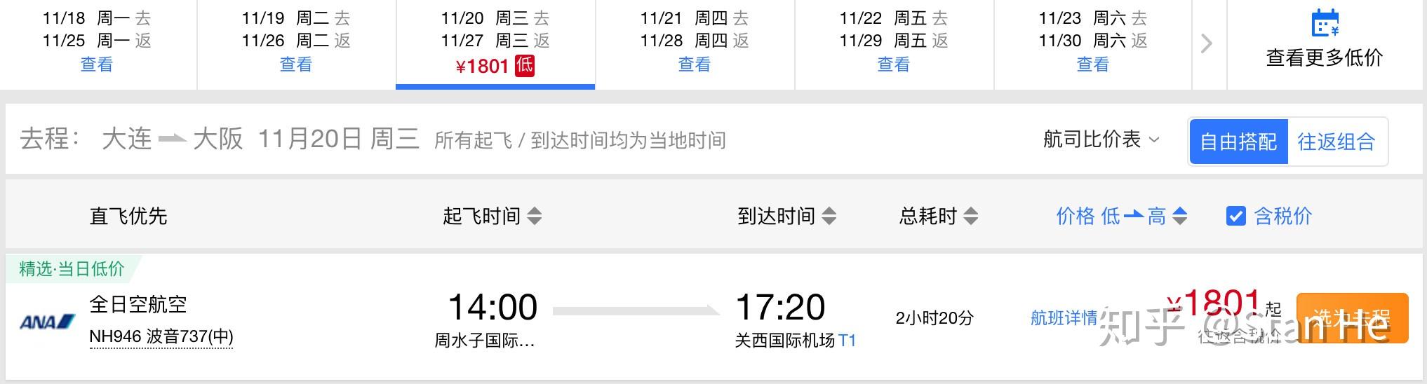大连⇄大阪,全日空国际航空,11月返程1801元