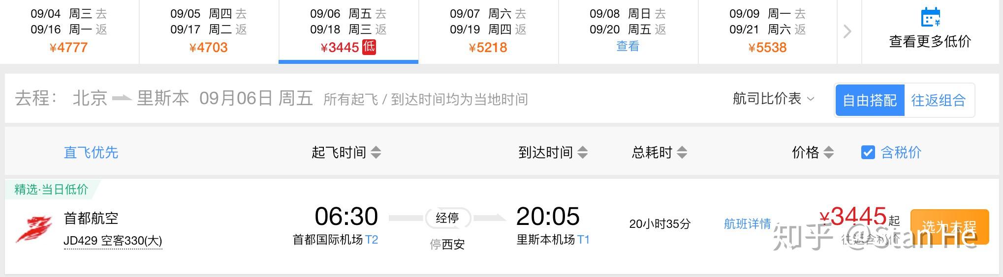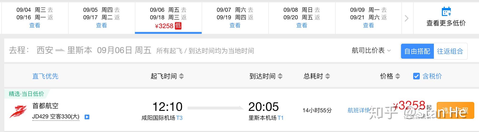 西安⇄里斯本,含税来往3258元,同样中秋节返程,首都国际航空的飞往航班