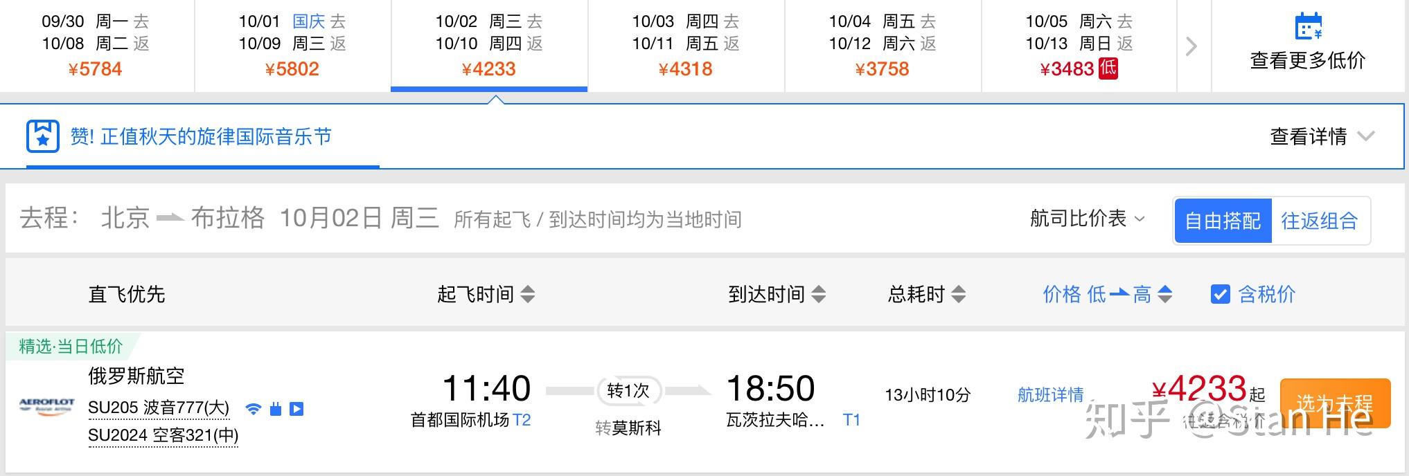 北京⇄布拉格,战斗民族俄航,经莫斯科直达,2号启程,10号返程,含税来往4233元