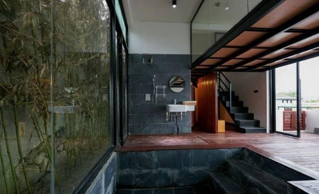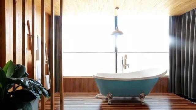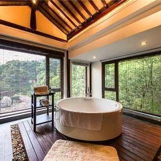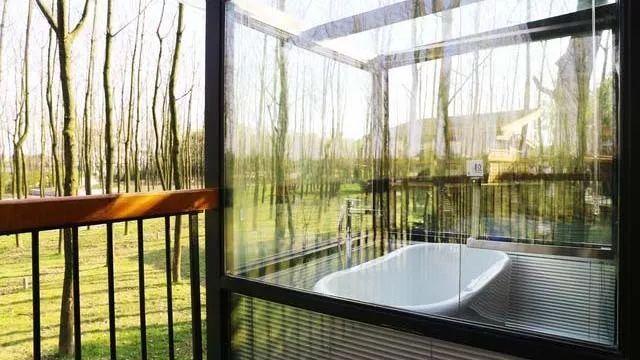玻璃浴室里,昂首可见参天大树,夜晚躺在浴缸里,头上有漫天繁星。