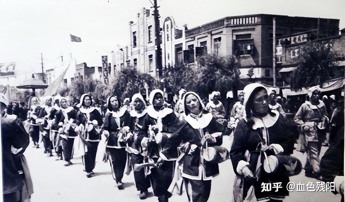 1952年国庆节全S各界代表敲锣打鼓、载歌载舞,浩大的国庆**步队穿过中山路