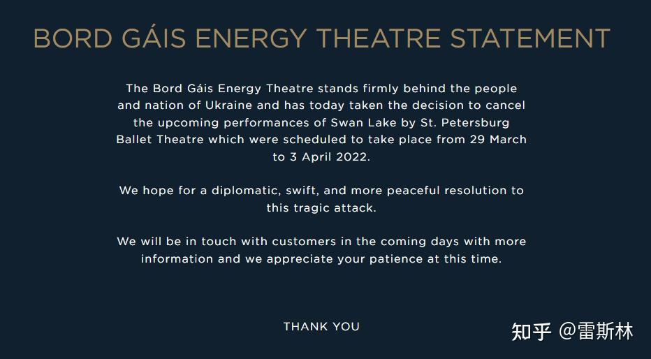 爱尔兰螺旋剧院打消了莫斯科皇家芭蕾舞的天鹅湖表演。