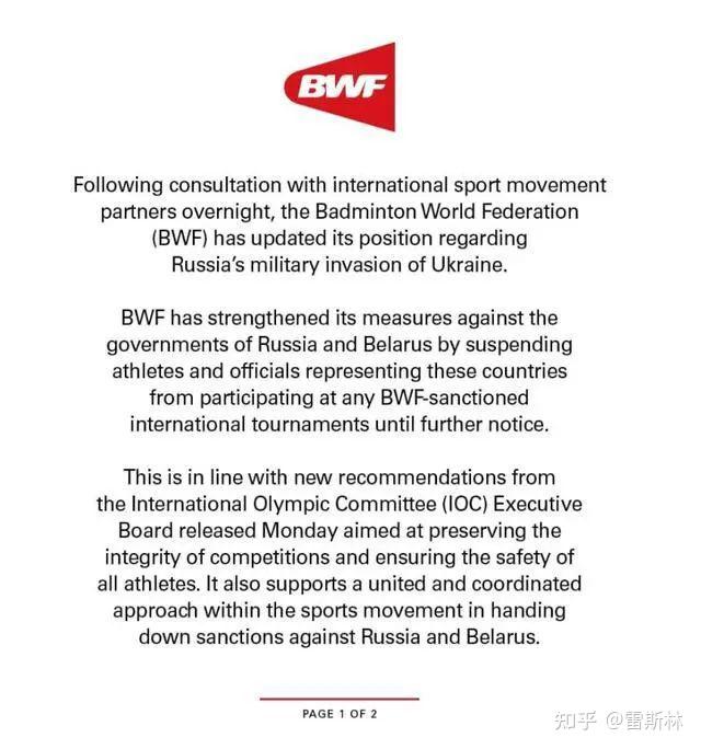 又是一个长长的名单,包罗世界羽联全面制止白俄罗斯选手参赛。