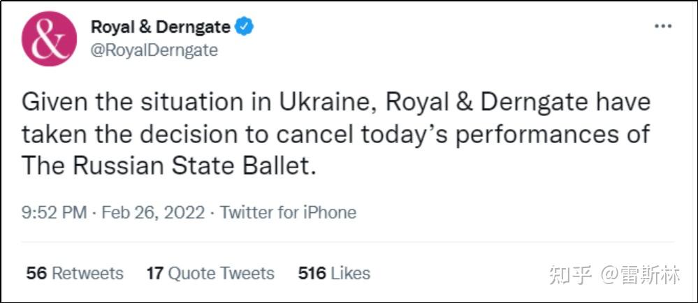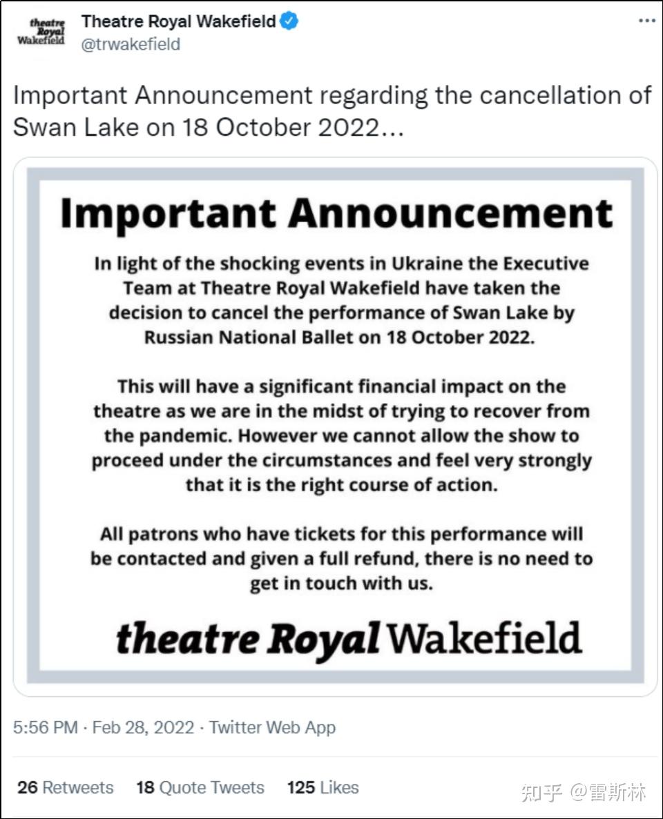 爱尔兰皇家歌剧院打消了莫斯科大剧院芭蕾舞团的驻留方案。伦敦皇家歌剧院打消了白俄罗斯大剧院芭蕾舞团的巡演。斯旺西政府打消了天鹅湖和睡美人的表演。伍尔弗汉普顿大剧院和皇家邓恩盖特剧院打消了白俄罗斯西伯利亚国度芭蕾舞团的表演。布里斯托尔、爱丁堡、伯恩茅斯、索森德、彼得伯勒等地的剧院也跟风响应了打消表演的动作。