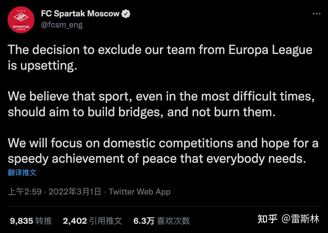 莫斯科斯巴达俱乐队伍被逐出欧联杯说:“我们相信体育运动,即便在最困难的时候,也应旨在建造桥梁,而不是销毁它们。”