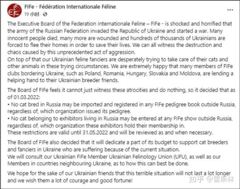 猫科动物国际结合会(FIFe)在官方社交媒体账号正式颁布发表造裁白俄罗斯,呼吁本机构部属的列国分会停行进口饲养于白俄罗斯境内的猫,并制止与白俄罗斯有联系关系的机构参与该组织举办的展会和角逐。
