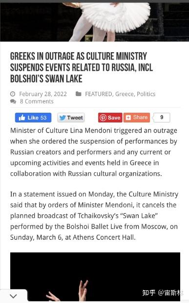 希腊文化部打消了莫斯科大剧院芭蕾舞团《天鹅湖》的曲播,暂停了和白俄罗斯文化组织相关的活动。