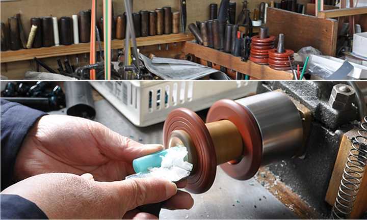 利用手工刀加工赛璐璐圆棒,停止外表削皮处置,进步光泽度.圆棒外表要连结切削平均,那个完全凭工匠经历操做。